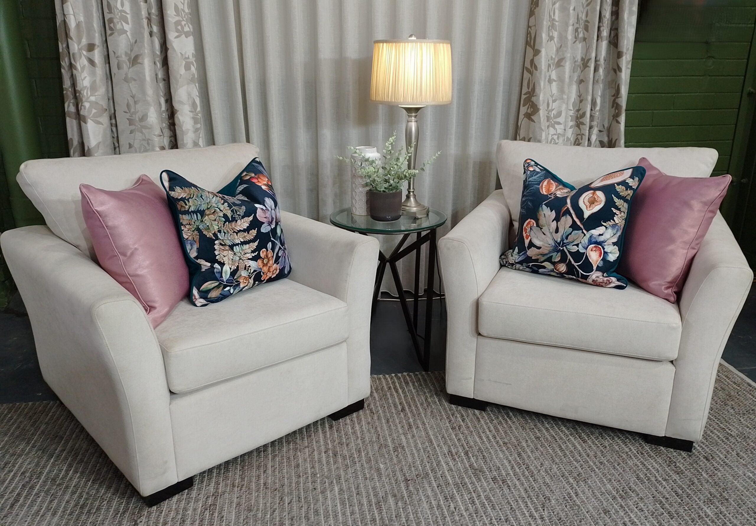 Upholstered in:– Warwick: Abbotsford, Colour: Snow (now discontinued)