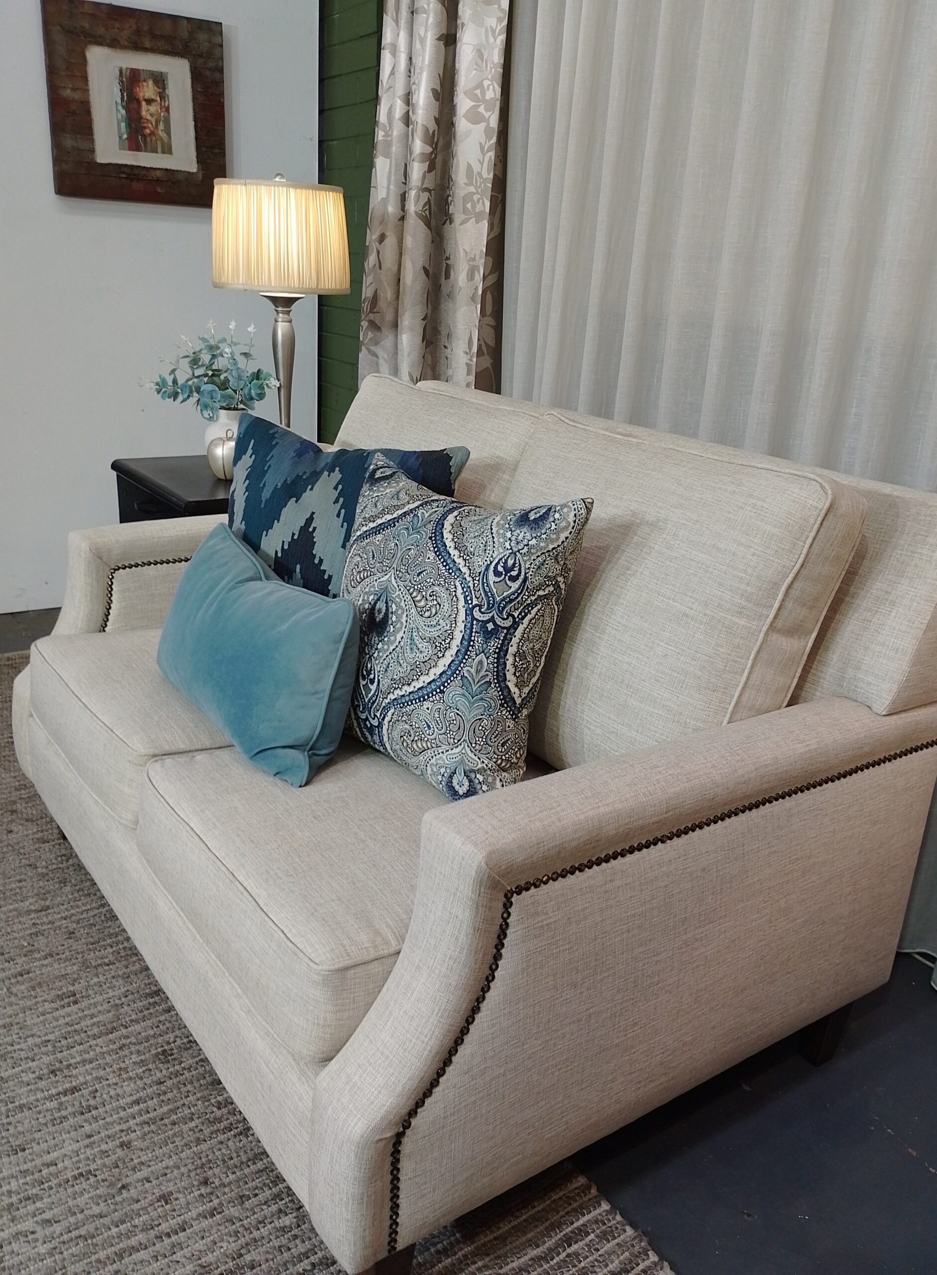 Piping or nail head trim in chrome or antique brass on the inside and outside arm panels.